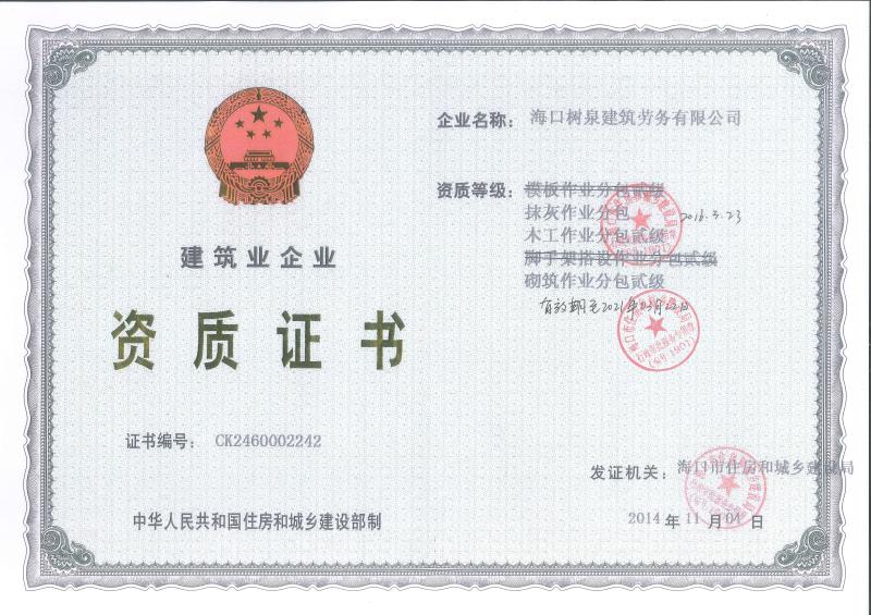 ??跇淙ㄖ趧沼邢薰境闪⒂?011年,公司位于???,其前身是一家專業建筑施工隊,自2004年即開始在海南從事建筑勞務施工。自成立至今,公司已經擁有一支科學管理、質量過硬、能打硬仗,搶工期的專業隊伍。能獨立承擔大中型工業與民用建筑 、室內外裝修、各類機電設備安裝工程。代表工程有海口濱海華庭、三亞時代海岸T01/02/04/05棟高層、合肥東?;▓@二期、陵水富力灣B區高層、三亞金中海(酒店)、瓊海大印經典花園、海口環球海景大酒店(四星級酒店,在建中)、陵水珍珠大廈(五星酒店)、海口萬達廣場、美蘭機場二期。
